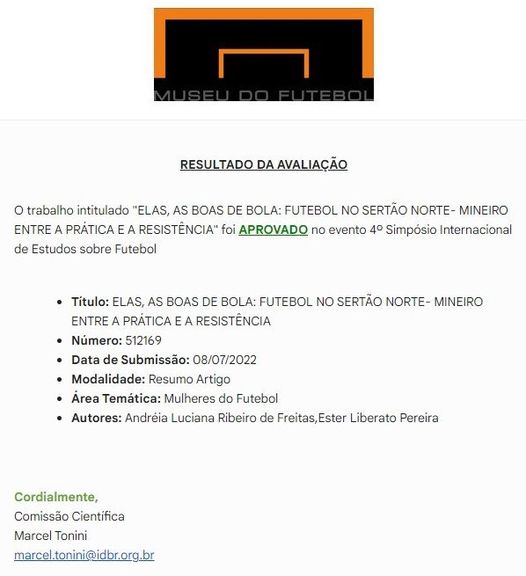 É com muita satisfação e orgulho que informamos que o trabalho “Elas, as boas de bola: futebol no sertão norte-mineiro entre a prática e a resistência”, de autoria da recém mestra pelo PPGH – Unimontes, Andréia Luciana Ribeiro de Freitas, foi aprovado para ser apresentado no 4° Simpósio Internacional de Estudos sobre Futebol!