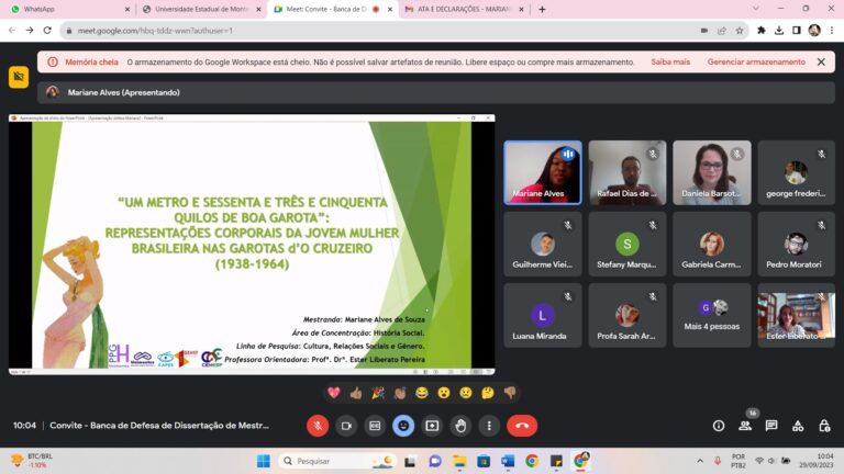 No dia 29 de setembro de 2023, ocorreu a apresentação pública da Dissertação de Mestrado de Mariane Alves de Souza, integrante do CEMESP e do Grupo de Estudos em História do Esporte e da Educação Física / Unimontes-MG (GEHEF), a qual foi aprovada com mérito. Sua dissertação é intitulada “‘Um metro e sessenta e três e cinquenta quilos de boa garota’: representações corporais da jovem mulher brasileira nas ‘Garotas’ d’O Cruzeiro (1938-1964)”, e foi orientada pela Profa. Dra. Ester Liberato Pereira, coordenadora do CEMESP.