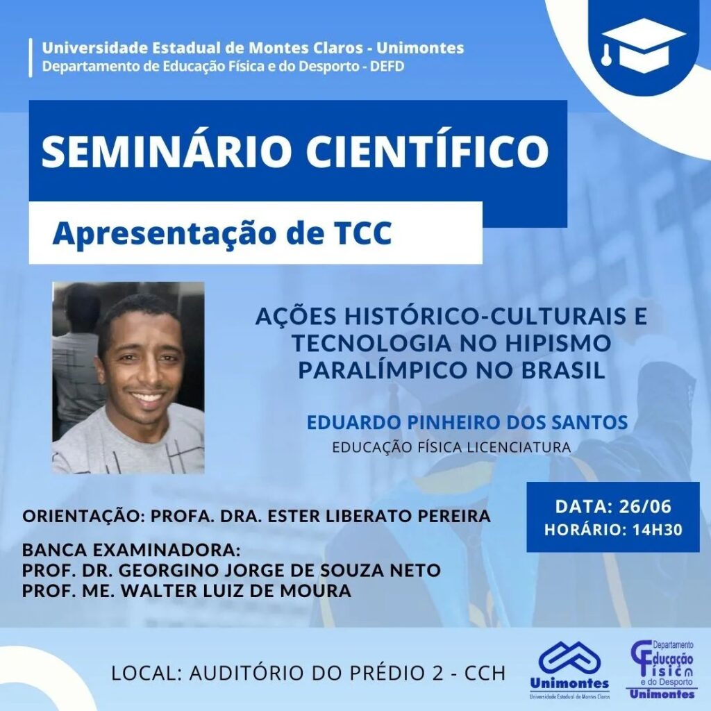 No dia 26 de junho de 2023, ocorrerá a apresentação pública do Trabalho de Conclusão de Curso (TCC) de graduação de Eduardo Pinheiro dos Santos, integrante do GEHEF e do Centro de Memória do Esporte – CEMESP/Unimontes. Sua monografia é intitulada “Ações histórico-culturais e tecnologia no hipismo paralímpico no Brasil”, e foi orientada pela Profa. Dra. Ester Liberato Pereira, líder do GEHEF e coordenadora do CEMESP.