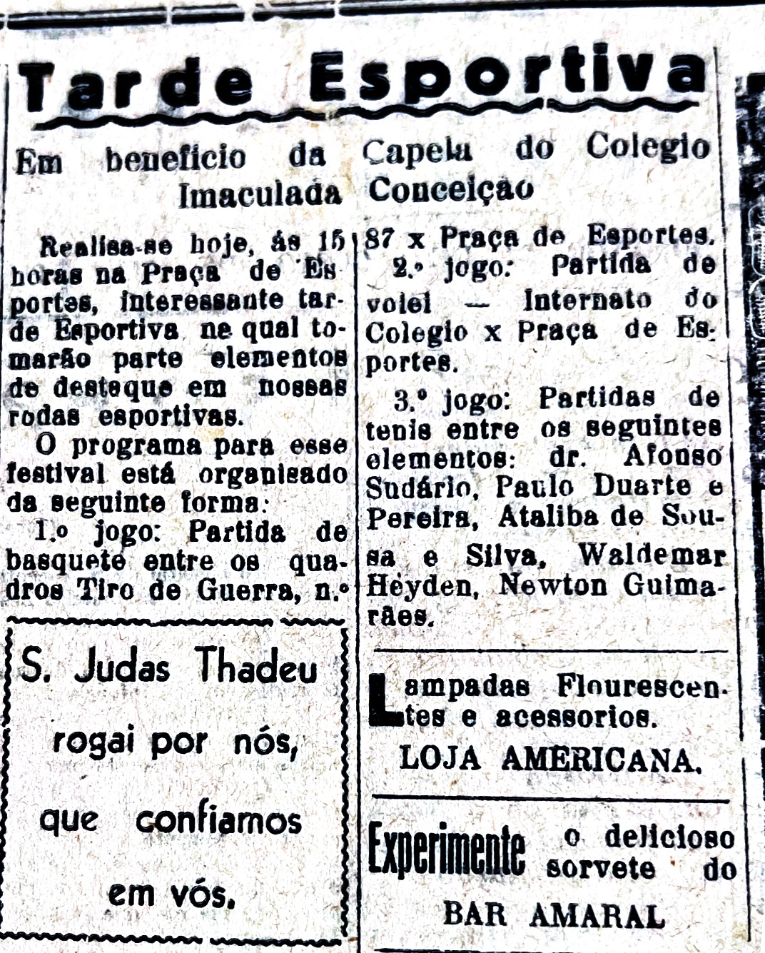 “Colégio Imaculada Conceição realiza tarde esportiva beneficente em 1949” Documento 1949 – edic?a?o 1196 (28_08) pa?g 02 Baixar MetadadosTitle"Colégio Imaculada Conceição realiza tarde esportiva beneficente em 1949"DescriptionTarde esportiva em benefício da Capela do colégio Imaculada Conceição. Fonte: Gazeta do Norte, 1949, ed. 1196,p.02Anexos