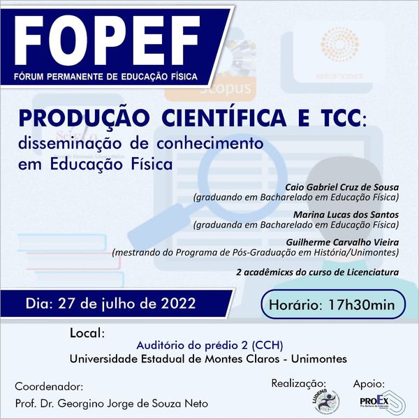 O integrante do CEMESP e mestrando do PPGH – Unimontes, Guilherme Carvalho Vieira, realizou uma fala, no dia 27/07/2022, no Fórum Permanente de Educação Física (FOPEF) da Unimontes, a respeito de sua trajetória na área da pesquisa desde seu ingresso no grupo e na Iniciação Científica. Nossos