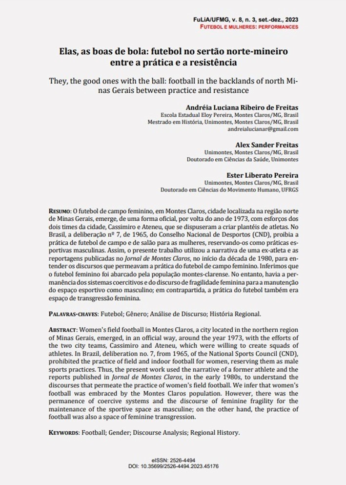 É com muita satisfação que anunciamos a publicação do artigo original intitulado “Elas, as boas de bola: futebol no sertão norte mineiro entre a prática e a resistência”, de autoria da Profa. Ma. Andréia Luciana Ribeiro de Freitas, da Escola Estadual Eloy Pereira, Montes Claros/MG, do Prof. Dr. Alex Sander Freitas, da Unimontes, Montes Claros/MG, e da coordenadora do CEMESP, Profa. Dra. Ester Liberato Pereira, também da Unimontes, Montes Claros/MG.